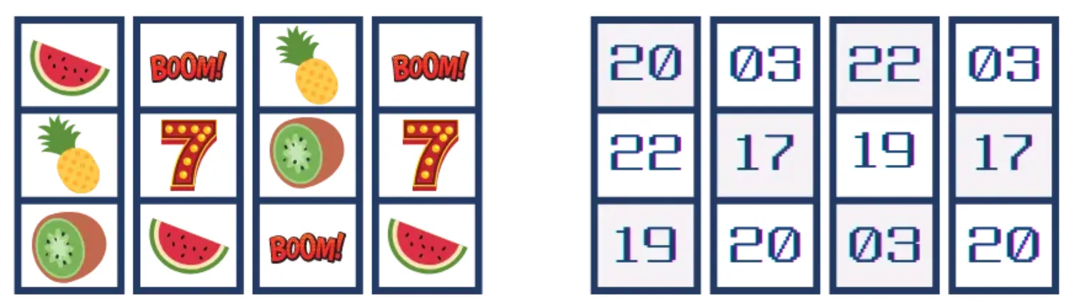 示例说明:玩家看到的转轮图案相当于一组数字;按下旋转按钮时,RNG 随机停在一组数字上(左边为玩家画面,右边为机器内部显示),这使得中奖纯属运气,无固定模式。