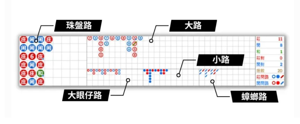 大路:以圆圈记录结果,红圈表示庄赢,蓝圈表示闲赢。若连续出现相同结果则向下排列,不同结果则向右换列。当出现和局时,在上一局的结果上画绿色斜线。若连续出现多次和局,则以绿色数字标注。